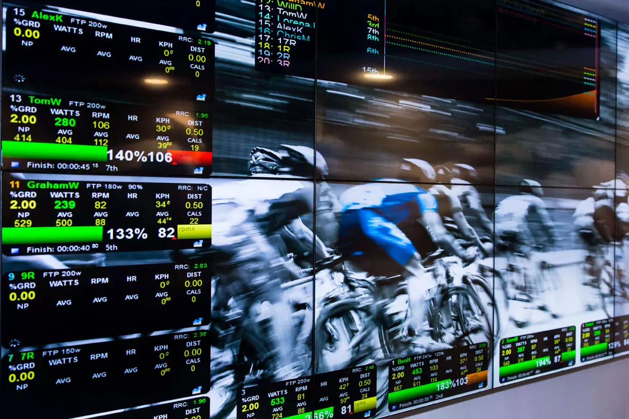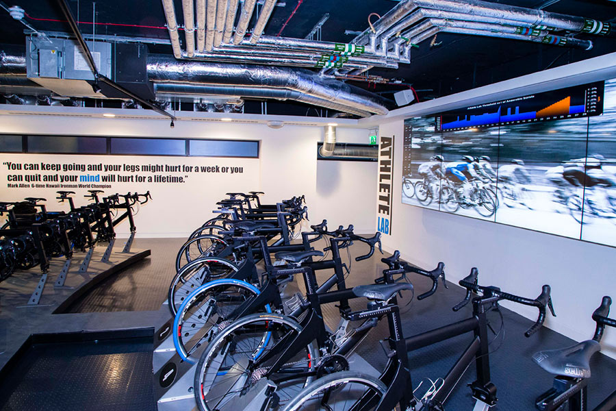 Link two floors to create a cutting edge visually rich space for group biking classes and individual training.