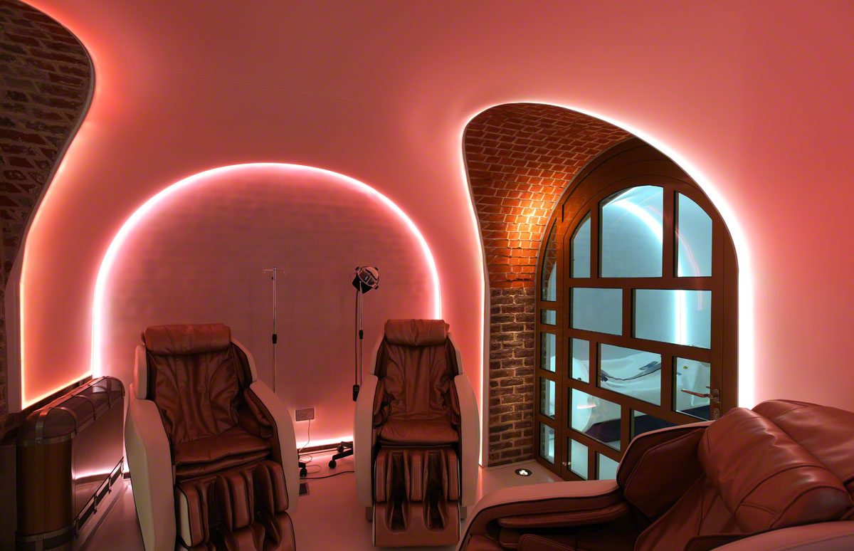 zynk used its interior architecture and spa design expertise to swathe the original brick walls and vaulted ceilings of the underground wine cellar with translucent, stretched fabric wall coverings. This unique application preserves the original brickwork and provides enough space for colour-changing backlights that enhance BelleCell’s revolutionary experience.