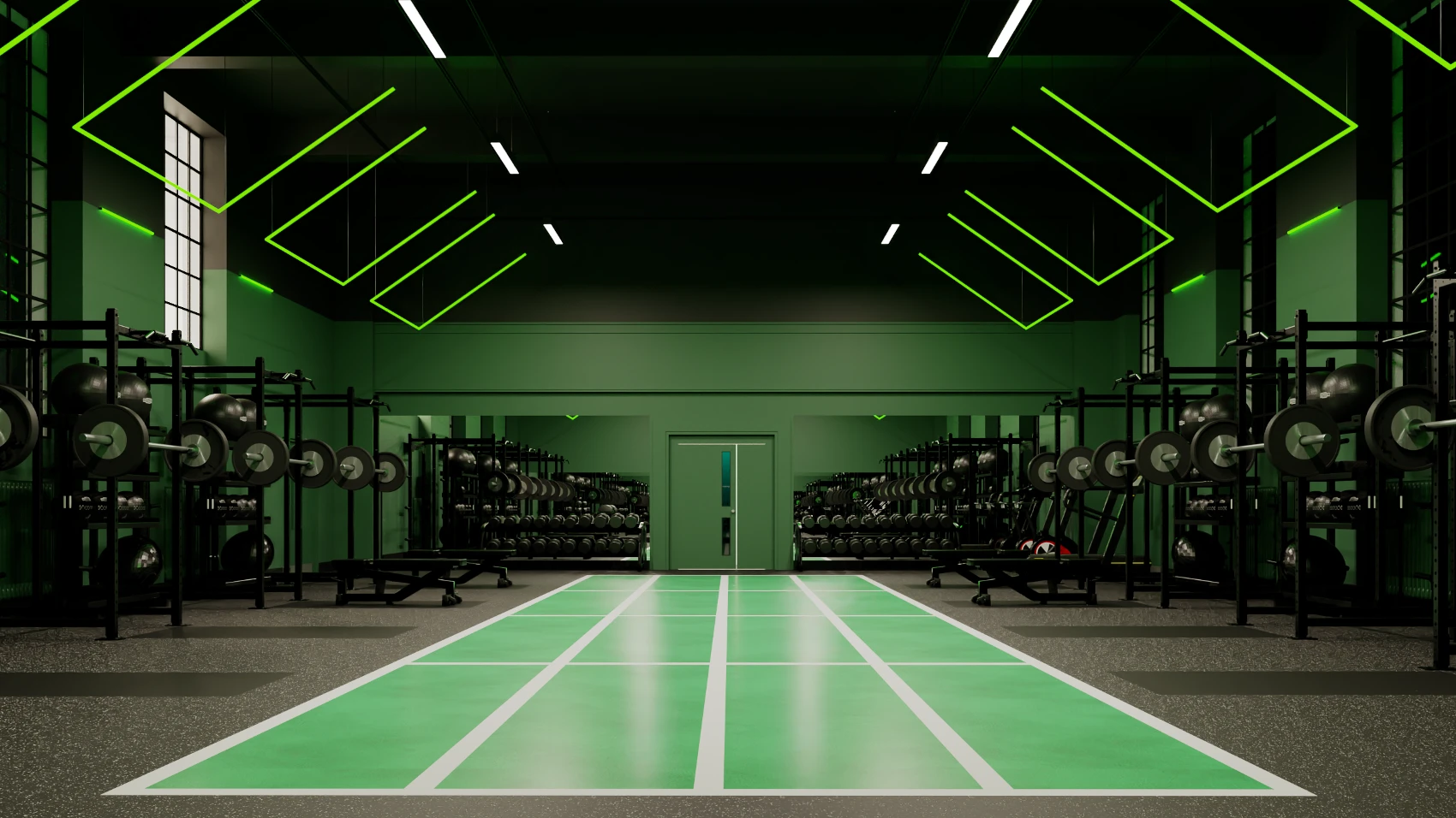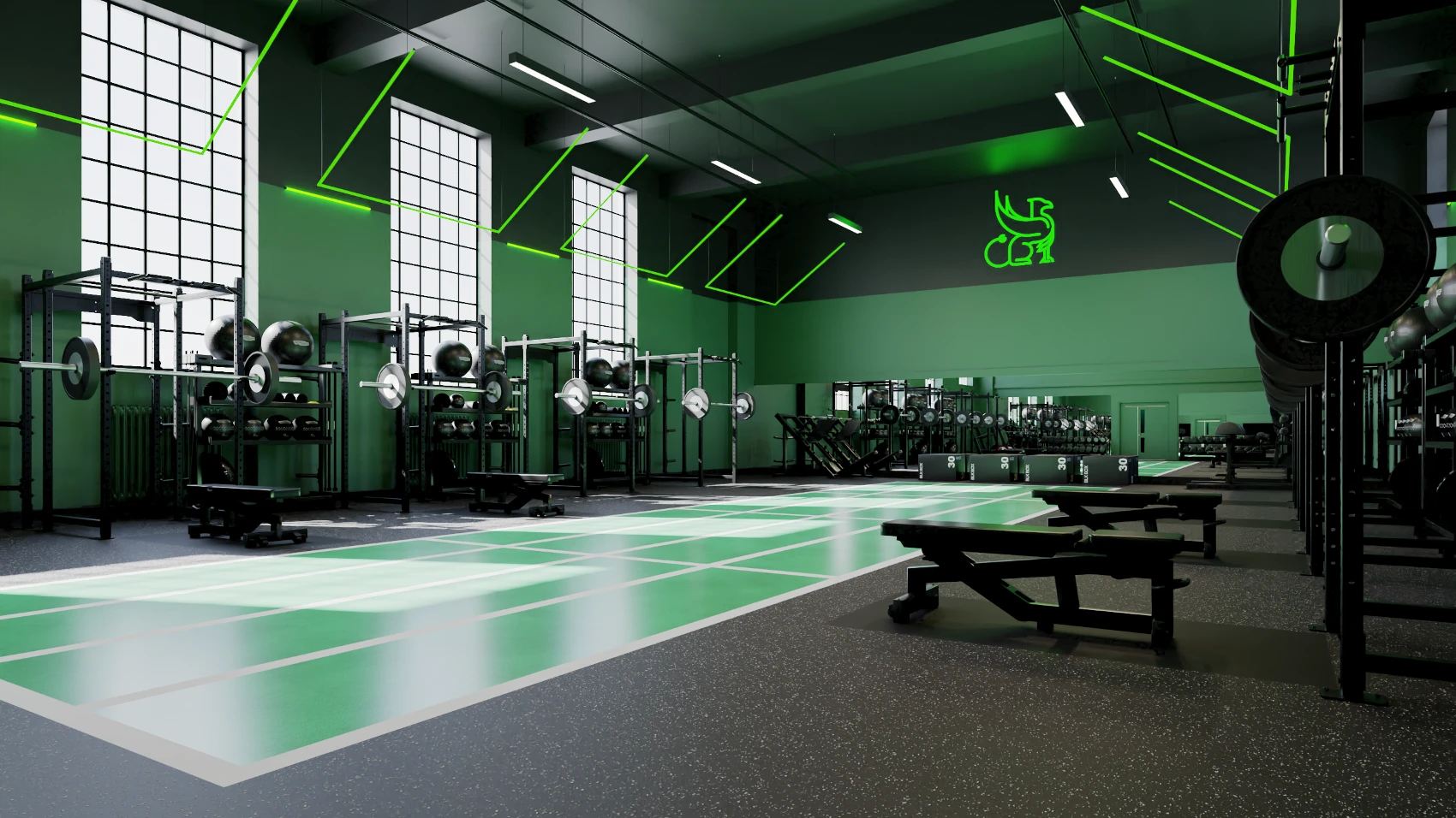 New rubber flooring has been laid over the previous studio foundations to provide an area for weightlifting activities. The space boasts 8 zones, defined by suspended green LED rafts alongside functional white lighting to highlight the entire space. The central track creates 3 main zones for various activities. New decoration and workout equipment has been incorporated into the space, in addition to an enhanced audio system.